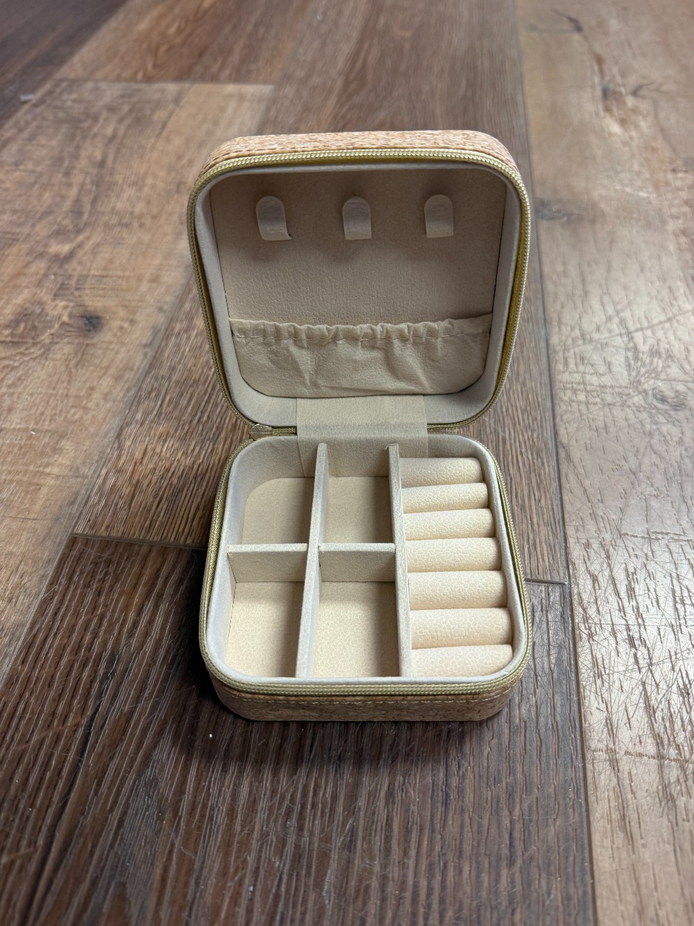 This jewelry travel case is made of a cork-like material and has beautiful blue & salmon designs on it! Perfect for rings, earrings, necklaces and more!