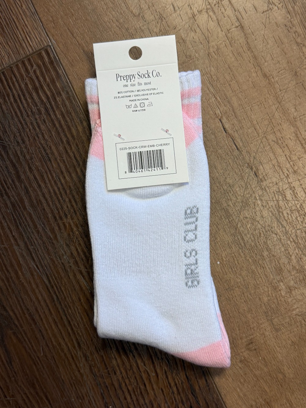 The Crew Sock by Simply Southern featuring an embroidered cherry with bow on the ankle and "Girls Club" on the bottom!
