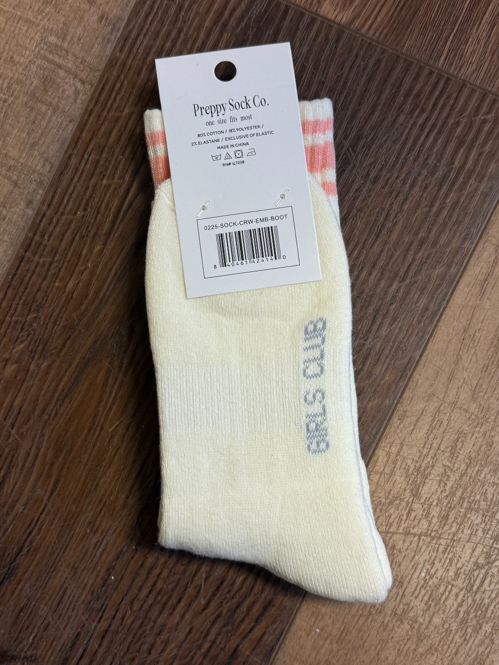The Crew Sock by Simply Southern featuring an embroidered pair of cowgirl boots with bow on the ankle and "Girls Club" on the bottom!